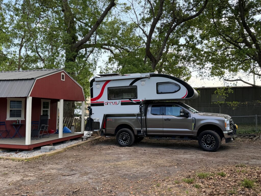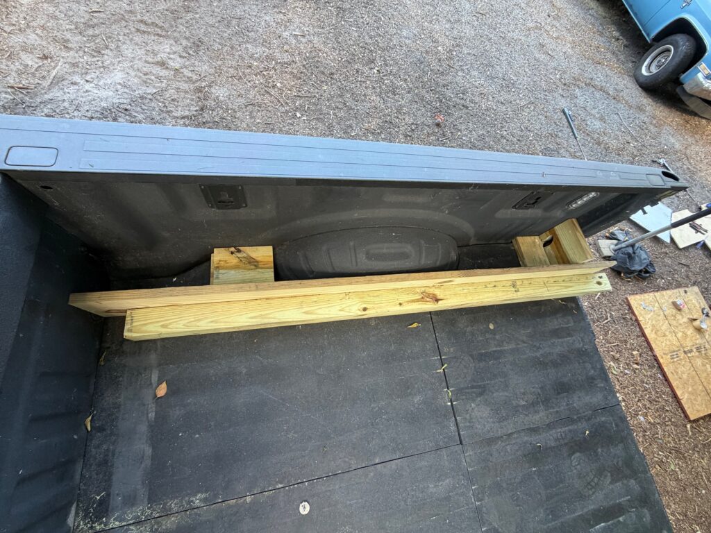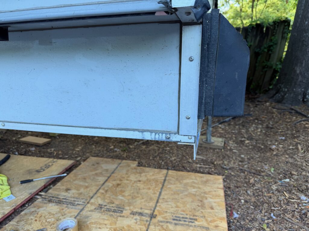I built a new foundation for the camper – which actually goes in the truck bed – but includes a strategically placed piece of angle attached to the front of the camper’s base. The angle sits right at the front of the base which really holds the camper in position front to back, while the tall sides keep the camper from moving sideways. I’m hoping this will at least significantly reduce damage caused by movement when off-road.